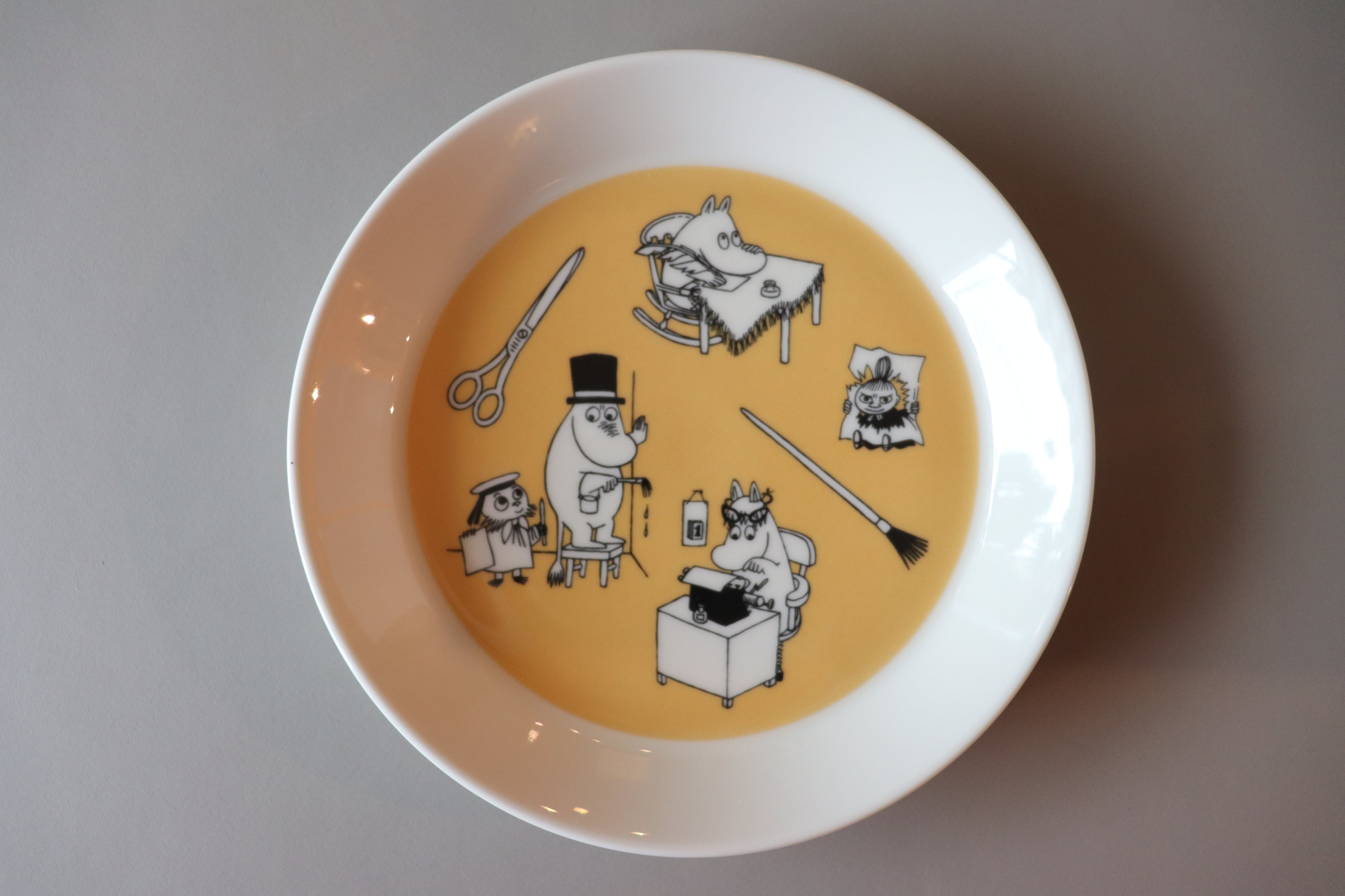 ムーミンたちはいつも新しいことに挑戦し、仕事にも果敢に挑戦します。ムーミンパパは責任感をもって、自分と家族のために仕事を見つけようとします。でもすぐに、さまざまな取り組みを「仕事」と呼ばないほうが楽しいことに気づきます。そして結局、オフィスで働くことは性に合わず、お給料をもらってする仕事は必要ないのだと思いいたるのです。1996年にアラビアのマグカップで初めて登場した「オフィス」コレクターズプレートのイラストは書くこと、描くこと、そして絵を描くことをテーマにしたいくつかのムーミンのコミックスの物語が元になっています。