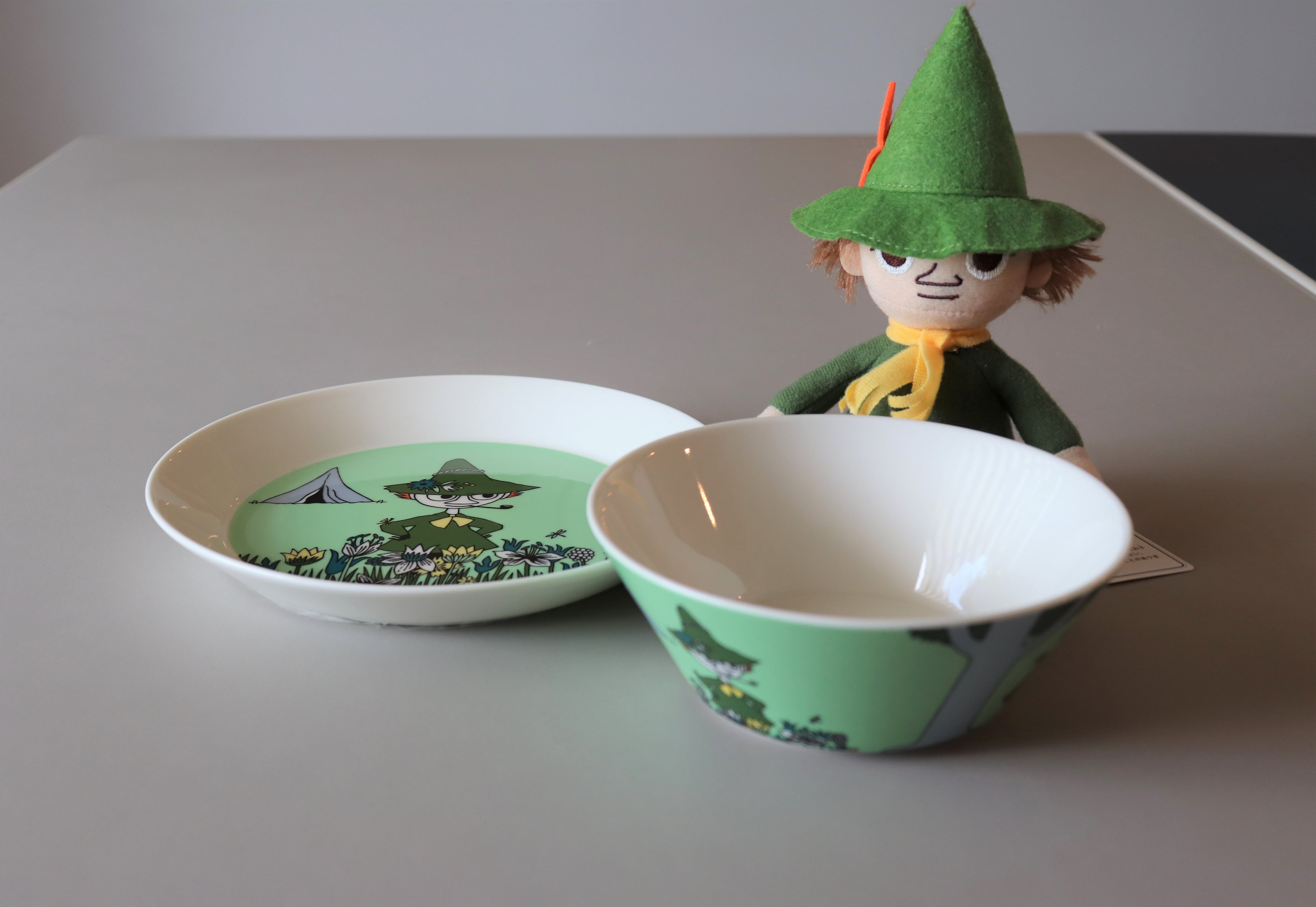 この「スナフキン」は2015年にリニューアルされたデザインです。『ひとりぼっちのムーミン』から、スナフキンがムーミンと初めて出会った場面が描かれています。スナフキンはムーミンの親友で、ちびのミイの異父弟。緑の帽子がトレードマークで、心が温かく、思索を好む放浪者で世界中を旅しています。また、ハーモニカを吹き、釣りを愛しています。